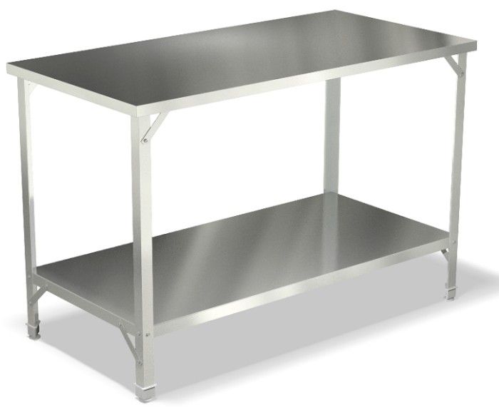 1500х600х850мм, Стол производственный без борта, столешница из нержавеющей стали AISI 430 толщиной 0,5 мм с подложкой ДСП толощиной 16 мм. Каркас из нержавеющей стали AISI 430 толщиной 1,5 мм, сплошная полка из нержавеющей стали AISI 430 толщиной 0,5 мм с усилителем. Полка стола выдерживает распределенную статическую нагрузку - 40 кг, столешница - 100 кг. Наличие подгибов по периметру столешницы и полки исключает опасность травм.