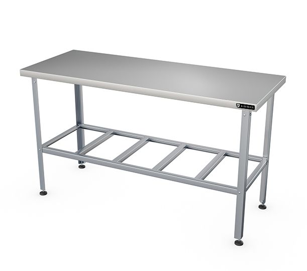 1100 х 600 х 870 мм, нагрузка на столешниц 99кг, без борта, столешница нерж. сталь AISI430 0,8мм, подложка столешницы ДСП 16мм. Каркас оцинк. сталь толщина металла 1,2мм, уголок 40х40мм. Полка - решетка из оцинк. стали. Отсутствие борта позволяет располагать стол в любом месте помещения и осуществлять работу на нем с любой стороны и может быть установлен в центре кухни. Регулируемые ножки 20мм. Вес 18,6кг. Изделие разборное и поставляется в удобной упаковке.