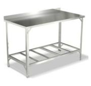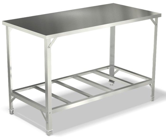 1500х600х850мм, Стол производственный без борта, столешница из нержавеющей стали AISI 430 толщиной 0,5 мм с подложкой ДСП толщиной 16 мм. Каркас из оцинкованной стали толщиной 1,5 мм, полка-решетка из оцинкованной стали толщиной 0,8 мм. Полка стола выдерживает распределенную статическую нагрузку - 20 кг, столешница - 100 кг. Наличие подгибов по периметру столешницы и полки исключает опасность травм.