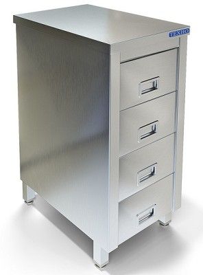 400х600х850мм, Стол-тумба без борта. Столешница из нержавеющей стали марки AISI 304 толщиной 0,8мм, ЛДСП толщиной 32 мм. Корпус и четыре выдвижных ящика из нержавеющей стали марки AISI 304 толщиной 0,8мм. Задняя стенка из оцинкованной стали толщиной 0,55мм. Регулируемые опоры. Стол поставляется в собранном виде.