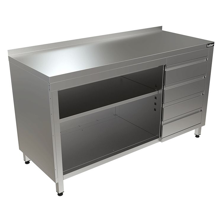 1500х600х870мм, Стол-тумба с бортом (столешница - нерж. сталь. aisi 430, усиление ЛДСП, каркас разборный из нерж. стали 430, распашные двери, 4 выдвижных ящика, полка), Ящики могут устанавливаться слева либо справа