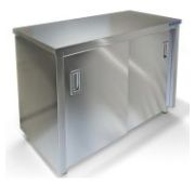 1000х600х850мм, Стол-тумба без борта. Столешница из нержавеющей стали марки AISI 430 толщиной 0,8мм, ЛДСП толщиной 32 мм. Корпус и две двери-купе из нержавеющей стали марки AISI 430 толщиной 0,8мм. Полка из нержавеющей стали марки AISI 430 толщиной 0,8мм. Задняя стенка из нержавеющей стали марки AISI 430 толщиной 0,8мм. Регулируемые опоры. Стол поставляется в собранном виде.