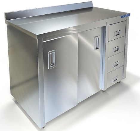 1400х700х850мм, Стол-тумба с бортом высотой 70мм. Столешница из нержавеющей стали марки AISI 430 толщиной 0,8мм, ЛДСП толщиной 32 мм. Корпус, две двери-купе и четыре выдвижных ящика расположенных справа изготовлены из нержавеющей стали марки AISI 430 толщиной 0,8мм. Задняя стенка из оцинкованной стали толщиной 0,55мм. Регулируемые опоры. Стол поставляется в собранном виде.