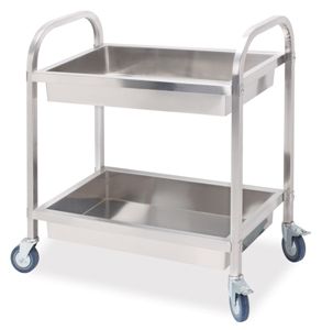 850х450х900мм, 10,4кг, сталь 201, каркас разборный из трубы 25,4х25,4мм, 2 полки глубиной 720x370x100мм, расстояние между полками 40см, 4 колёса (2 колеса со стопором), диаметр колес 4", материал колес: термопластичный каучук; макс. нагрузка на полку 20кг