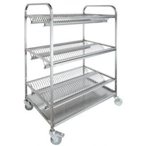 950х500х1100мм, Тележка для сушки посуды три уровня. Каркас разборный из трубы 20х20 нержавеющей стали марки AISI 304 толщиной 1,2мм. Три полки на 105 тарелок. Полки и поддон изготовлены из нержавеющей стали марки AISI 304 толщиной 0,8мм. Тележка поставляется в разобранном виде.