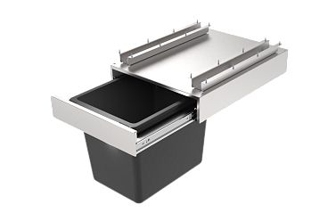 515х400х338мм, габариты рабочего объема урны 440х400х295мм, материал корпуса нерж. сталь AISI430 0,8мм. Материал емкости высокопрочный пластик. Емкость урны имеет крышку, которая плотно прилегает к корпусу благодаря боковым прижимам. Возможность крепления урны в любой части стола позволяет лучше оптимизировать рабочее место. Шариковые направляющие с доводчиком облегчают работу с урнной, делая её выдвижение плавным. Монтаж урны к подложке стола осуществляется шурупами, которые входят в комплект поставки урны. Объем емкости 25л. Вес 9,8кг. Урна подвесная выдвижная крепится вниз столешницы разделочного стола серии СЦ/СП/СПУ и служит для сбора мусора, образующегося в процессе работы персонала.
