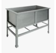 1000х530х850мм, Две сварные емкости размером 430х430х300 из нержавещей стали марки AISI 304 толщиной 0,8мм. Каркас сварной из уголка 40х40 толщиной 2мм, покрытого порошковой краской серого цвета, внизу по периметру обвязка. Ванна комплектуется выпуском с нержавеющей решеткой и механическим запорным клапаном, диаметр выпуска 90мм, диаметр подключаемого сифона 50мм, регулируемые опоры. На дне ванны ребра (лучи) для жесткости и снижения вибрации. Ванна поставляется в собранном виде.