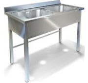 1000х600х850мм, Две цельнотянутые емкости размером 400х400х250 из нержавеющей стали марки AISI 304 толщиной 1мм, обнижение 2мм. Объемный пристенный борт высотой 70мм. Каркас сварной из уголка 40х40 нержавеющей стали марки AISI 430 толщиной 2мм, внизу по периметру обвязка. Ванна комплектуется выпуском с нержавеющей решеткой и механическим запорным клапаном, диаметр выпуска 90мм, диаметр подключаемого сифона 50мм, перелив, регулируемые опоры. На дно ванны нанесена виброшумоизоляция. Ванна поставляется в собранном виде.