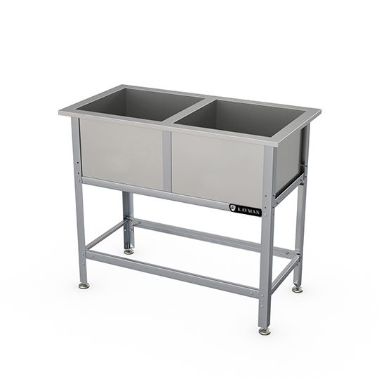 Габариты 1350х700х870 мм, внутренние размеры ванны 600х600х450 мм, сварная, 2 секции, ширина бортов по периметру ванны 50мм, диаметр сливного отверстия 48мм, ванна AISI304 0,8мм, каркас 1,2мм оцинкованная сталь, профиль уголок 40х40мм, регулировка ножек 20мм.Все кромки ванны и элементов каркаса имеют подгиб (фальцовку). В комплект поставки ванны входит система разрыва струи.