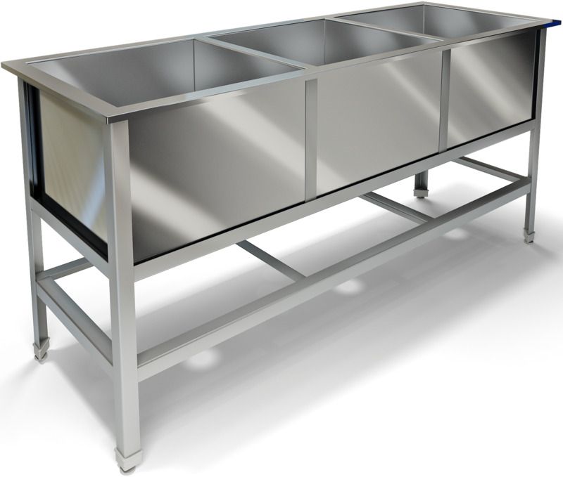 1750х600х850мм, Три сварные емкости размером 530х500х400 из нержавеющей стали марки AISI 304 толщиной 0,8мм, крыло. Каркас сварной из уголка 40х40 нержавеющей стали марки AISI 430 толщиной 2мм, внизу по периметру обвязка. Ванна комплектуется выпуском с нержавеющей решеткой и механическим запорным клапаном, диаметр выпуска 90мм, диаметр подключаемого сифона 50мм, регулируемые опоры. На дне ванны ребра (лучи) для жесткости и снижения вибрации. Ванна поставляется в собранном виде.