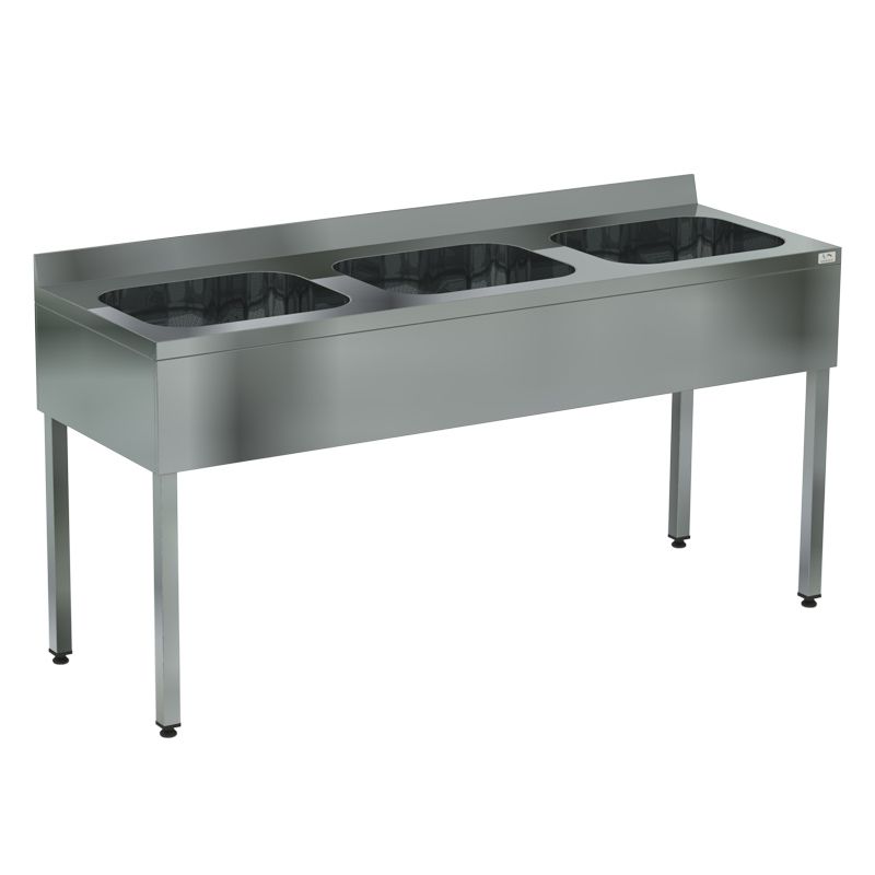 1800х600х870мм, Ванна моечная цельнотянутая трехсекционная (ёмкость - нерж. сталь. aisi 304, каркас нерж. труба 40х40, фартук с 4-х сторон), (ёмкость 500х400х250)