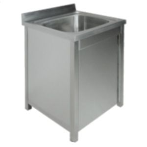700х700х850мм, Одна цельнотянутая емкость размером 600х500х300 из нержавеющей стали марки AISI 304 толщиной 1мм, обнижение 2 мм. Объемный пристенный борт высотой 70мм. Корпус из трубы 40х40 нержавеющей стали марки AISI 304 толщиной 1,2мм.и боковых панелей из нержавеющей стали марки AISI 304 толщиной 0,8мм. Одна распашная дверь, полка. Ванна комплектуется выпуском с нержавеющей решеткой и механическим запорным клапаном, диаметр выпуска 90мм, диаметр подключаемого сифона 50мм, перелив, регулируемые опоры. На дно ванны нанесена виброшумоизоляция. Ванна поставляется в собранном виде.
