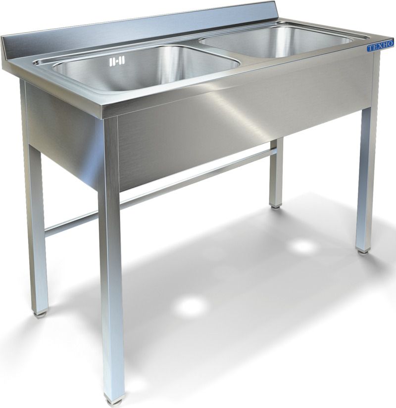 1200х700х850мм, Две цельнотянутые емкости размером 500х500х300 из нержавеющей стали марки AISI 304 толщиной 1мм, обнижение 15 мм. Объемный пристенный борт высотой 70мм. Фартук с 3-х сторон высотой 285 мм. Каркас сварной из трубы 40х40 нержавеющей стали марки AISI 430 толщиной 1,2мм, с тыловой части установлены две перемычки для жесткости. Ванна комплектуется выпуском с нержавеющей решеткой и механическим запорным клапаном, диаметр выпуска 90мм, диаметр подключаемого сифона 50мм, перелив, регулируемые опоры. На дно ванны нанесена виброшумоизоляция. Ванна поставляется в собранном виде.