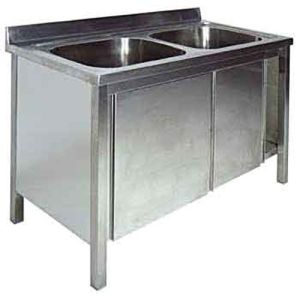 1200х700х850мм, Две цельнотянутые емкости размером 500х500х300 из нержавеющей стали марки AISI 304 толщиной 1мм, обнижение 15 мм. Объемный пристенный борт высотой 70мм. Корпус сварной из нержавеющей стали марки AISI 304 толщиной 0,8мм. Двери-купе, полка. Ванна комплектуется выпуском с нержавеющей решеткой и механическим запорным клапаном, диаметр выпуска 90мм, диаметр подключаемого сифона 50мм, перелив, регулируемые опоры. На дно ванны нанесена виброшумоизоляция. Ванна поставляется в собранном виде.