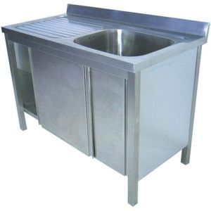 1200х700х850мм, Одна цельнотянутая емкость размером 500х500х300 из нержавеющей стали марки AISI 304 толщиной 1мм, ванна справа, обнижение 15мм, крыло рифленое с сушкой и наклоном для стекания воды с посуды в ванну. Объемный пристенный борт высотой 70мм. Корпус сварной из нержавеющей стали марки AISI 304 толщиной 0,8мм. Двери-купе, полка. Ванна комплектуется выпуском с нержавеющей решеткой и механическим запорным клапаном, диаметр выпуска 90мм, диаметр подключаемого сифона 50мм, перелив, регулируемые опоры. На дно ванны нанесена виброшумоизоляция. Ванна поставляется в собранном виде.