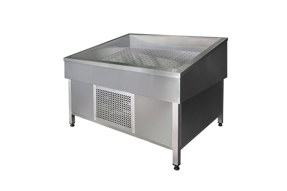 Витрина предназначена для охлаждения и демонстрации рыбы и морепродуктов на льду. Витрина изготавливается с принудительным охлаждением. Изделие выполнено под наклоном, что позволяет покупателю видеть содержимое емкости. Двойные стенки позволяют поддерживать определенную температуру в емкости и замедляют процесс таяния льда, а вмонтированный кран для слива воды позволяет подсоединить ванну напрямую к системе водоотведения. Охлаждение нижней стенки ванны происходит за счет встроенной холодильной системы, позволяющей сохранить как можно дольше лед, который неизбежно тает, контактируя с внешней средой. Все элементы витрины выполнены из нержавеющей стали. Поставляется в собранном виде. Технические характеристики: Температурный режим: -1...+1°С Мощность: 0,5кВт Статическое охлаждение Напряжение питания: 220В/50Гц Габариты: 1400х1000х690/930