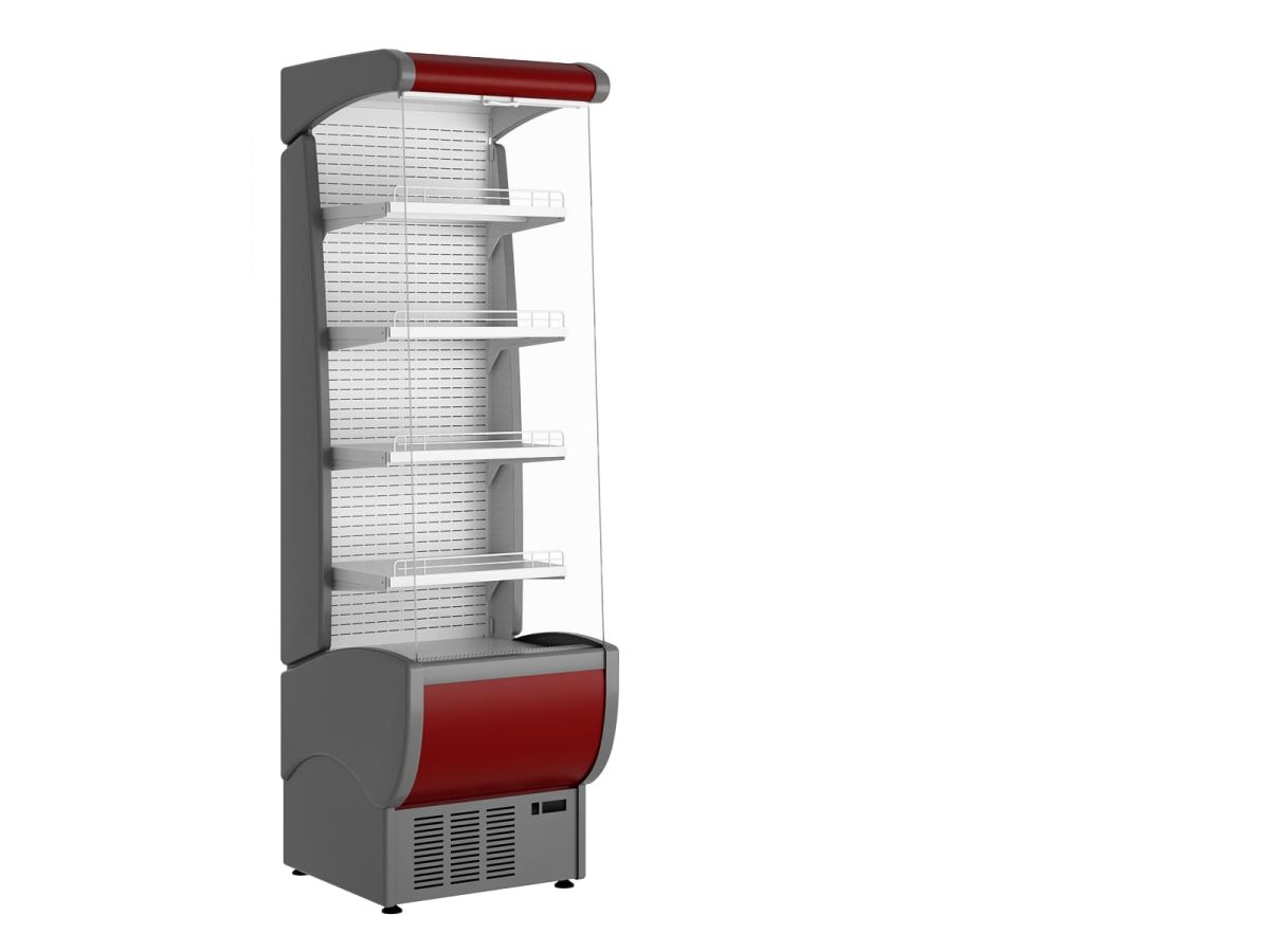 591х697х2070, t режим +1…+10 C. Витрина холодильная,со встроенным агрегатом, гнутое стекло, 4 металлических полки, полезный объемвыкладки— 0,29 м3,охлаждаемая площадь поддонов для выкладки продуктов 1,00 м2, динамическое охлаждение, оттайка ТЭН, потр. эл.энергии в сутки —9 кВт, R404A, цвет корпуса —белый, фриз и щиток — красный, 14,4Вт, 220В.