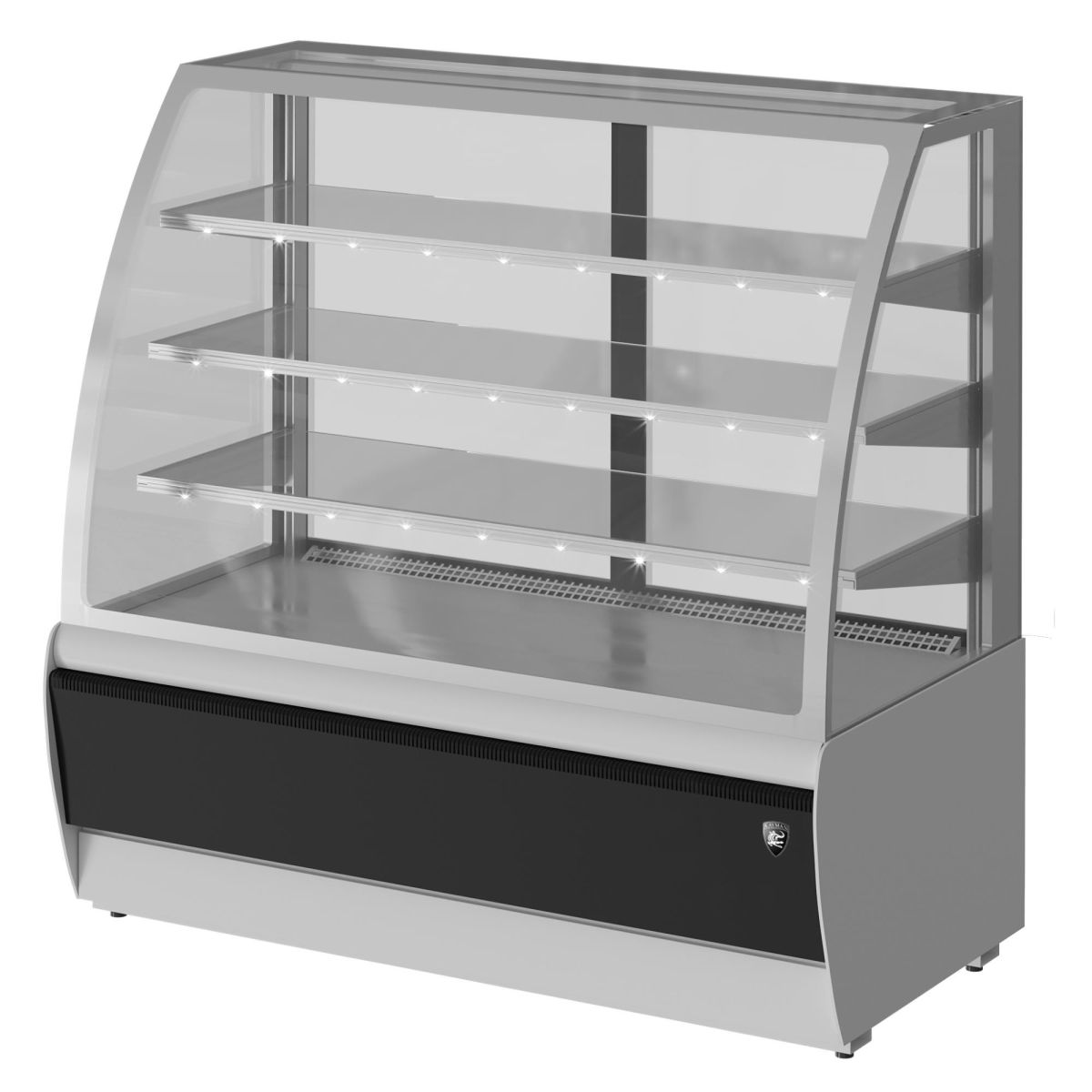 1300х700х1280, t режим …0+7 С. Витрина кондитерская, (0…+7С),со встроенным агрегатом, гнутое стекло, стеклопакет, 3 стеклянные полки с подсветкой LED свет тепло-белый, полезный объем — 0,28м3, размер выкладки - 1236*460, 3 полки: 1230*350, экспозиционная охлаждаемая площадь — 1,86м2, вентилируемое охлаждение, раздвижные задние шторки, автоматическая оттайка/ТЭНы, выпариватель, потр. эл.энергии в сутки — 8кВтч/сутки, 200кг, R134а, цвет корпуса — серо-черный, 220В, 0,7кВт