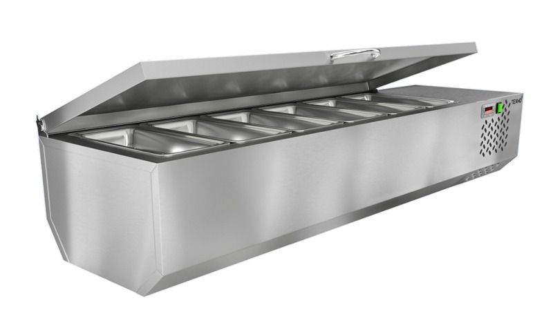 1390х385х290мм, Витрина охлаждаемая настольная с крышкой, изготовлена из нержавеющей стали марки AISI 430. Температурный режим +2…+7, вместимость: GN 1/3 - 6х150, мощность 100Вт. Компрессор (Китай). Хладон R-134. Поставляется в собранном виде.