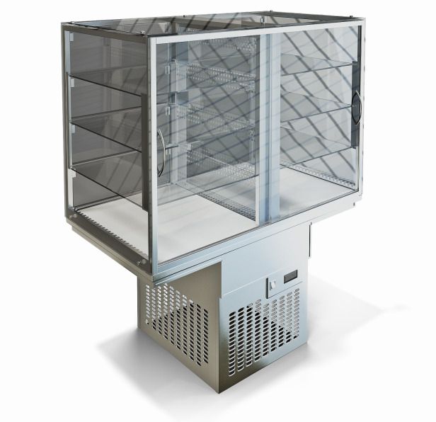 1025х590х1240мм, Витрина охлаждаемая, корпус закалённое стекло толщиной 8 мм, три уровня из закалённого стекла толщиной 5 мм, хладоагрегат мощность 485 Вт, компрессор Danfoss. Двери-купе со стороны оператора, лючками со стороны покупателя, подсветкой. Поставляется в собранном виде.